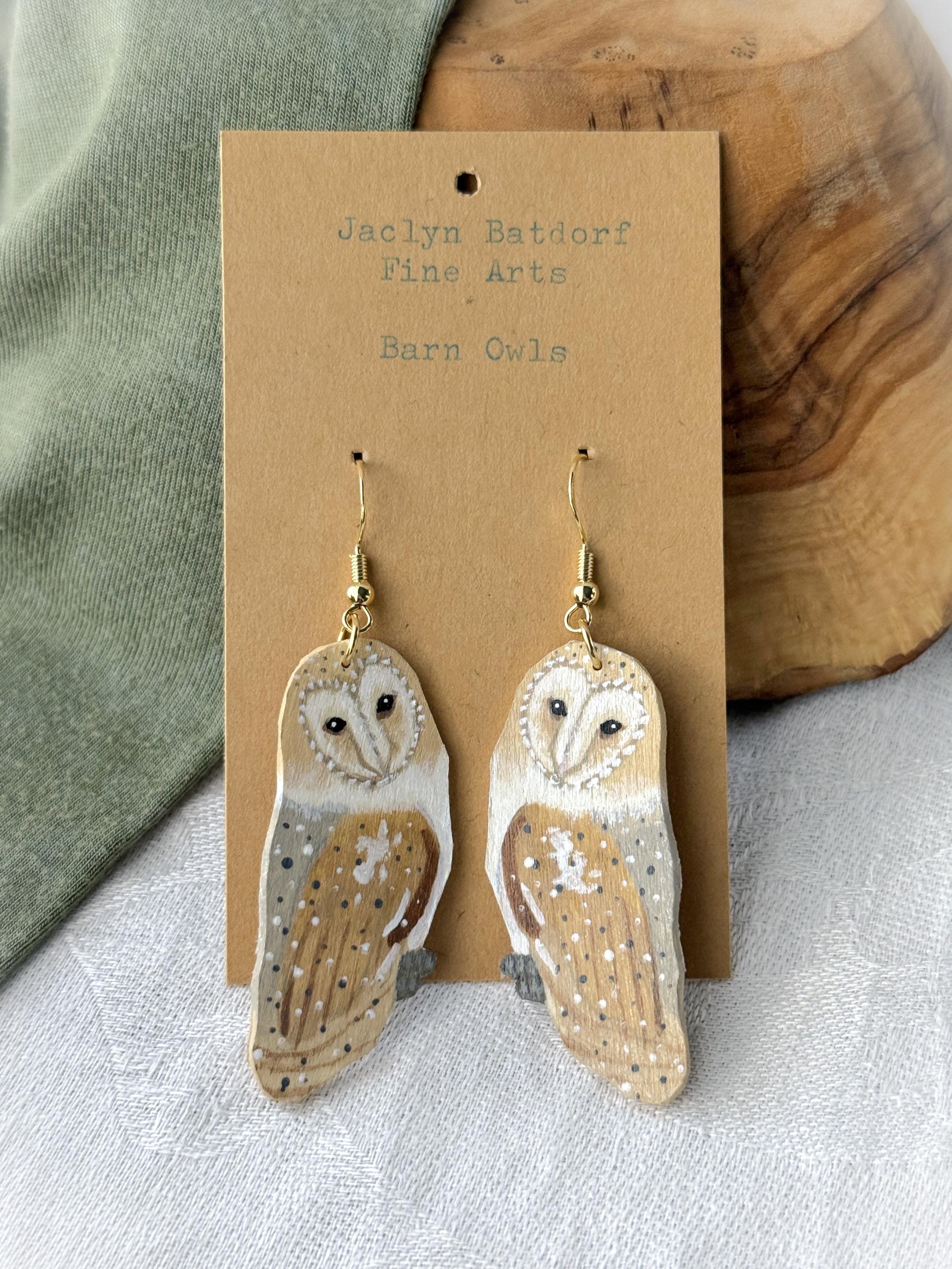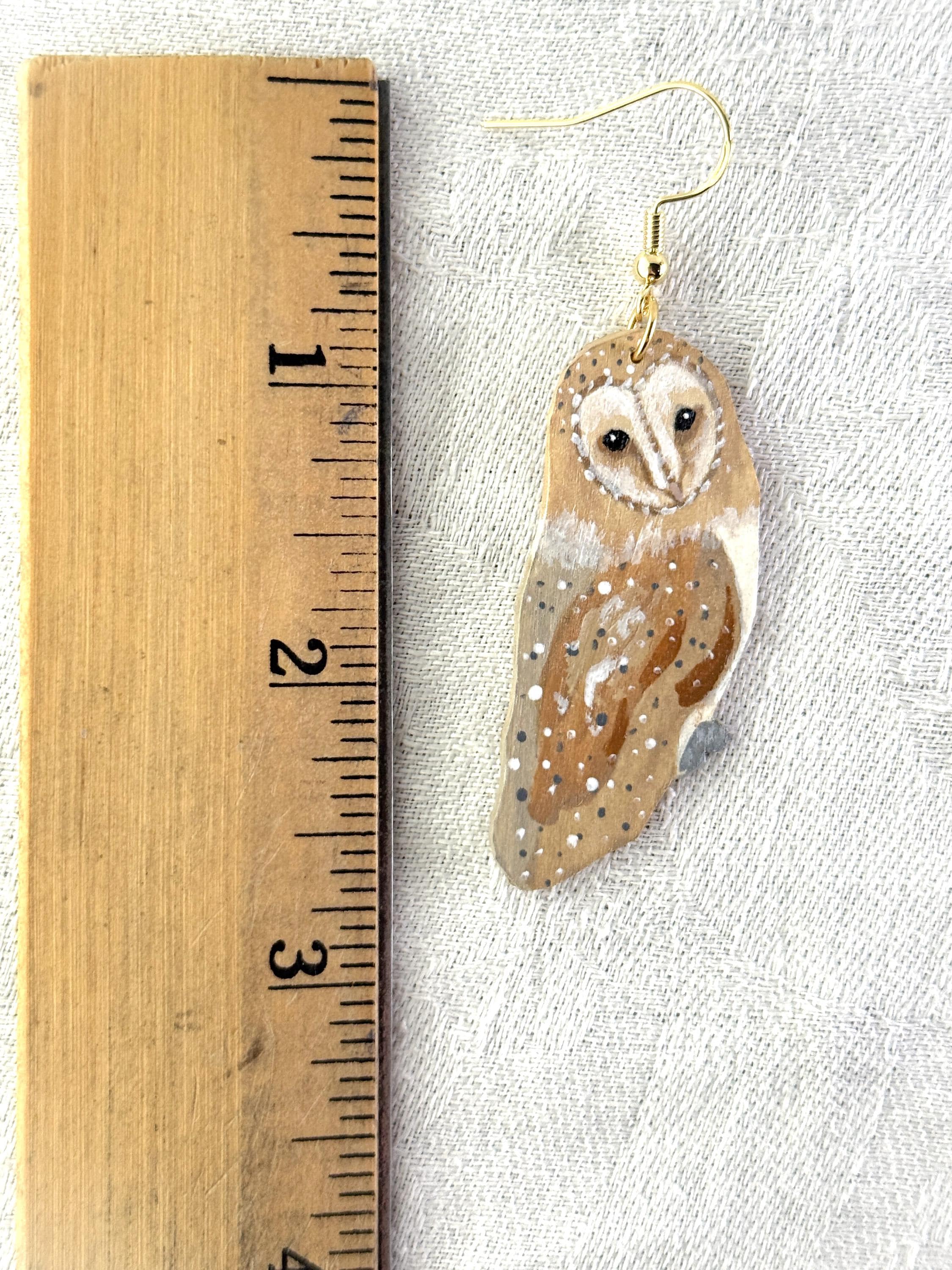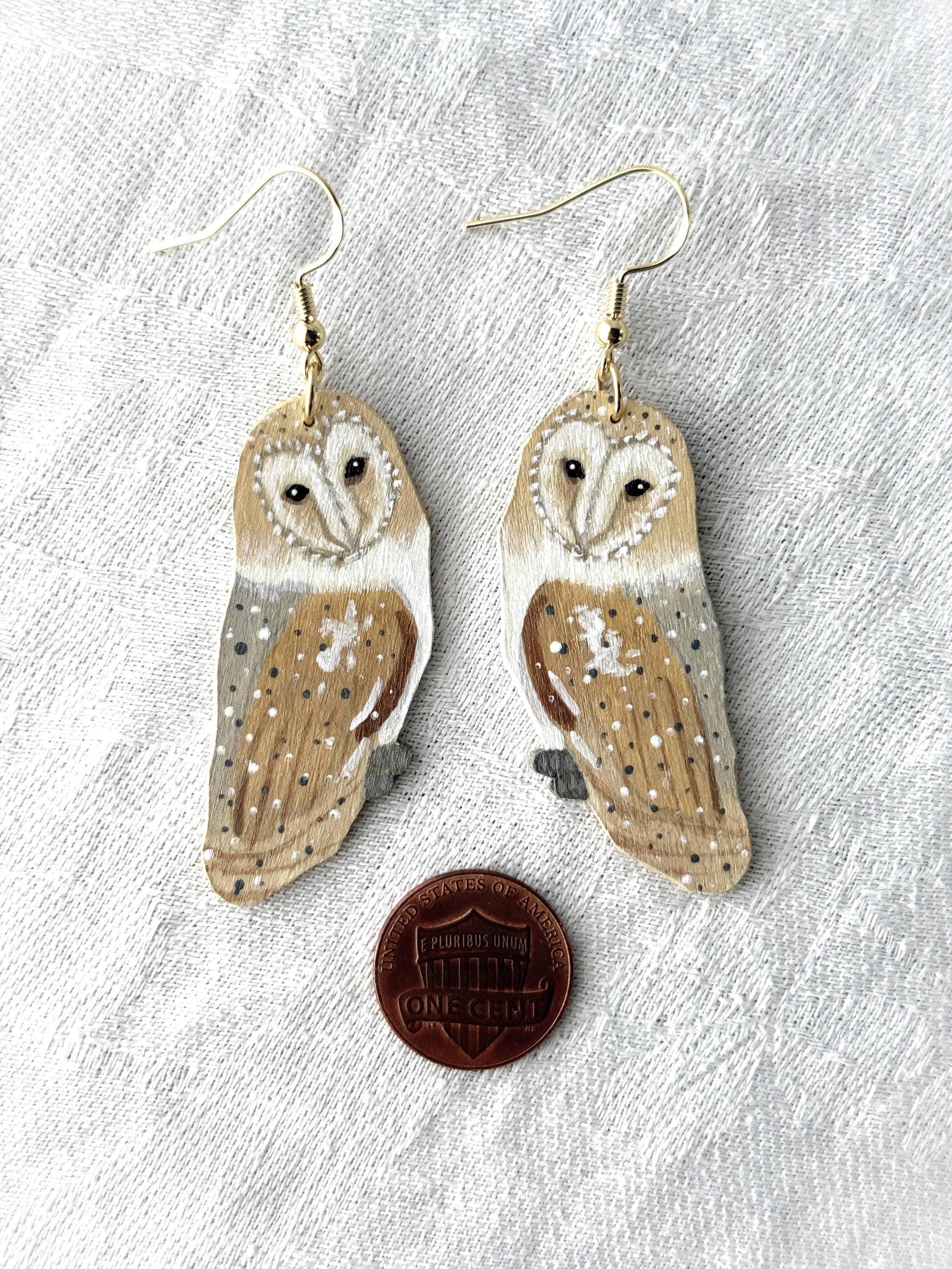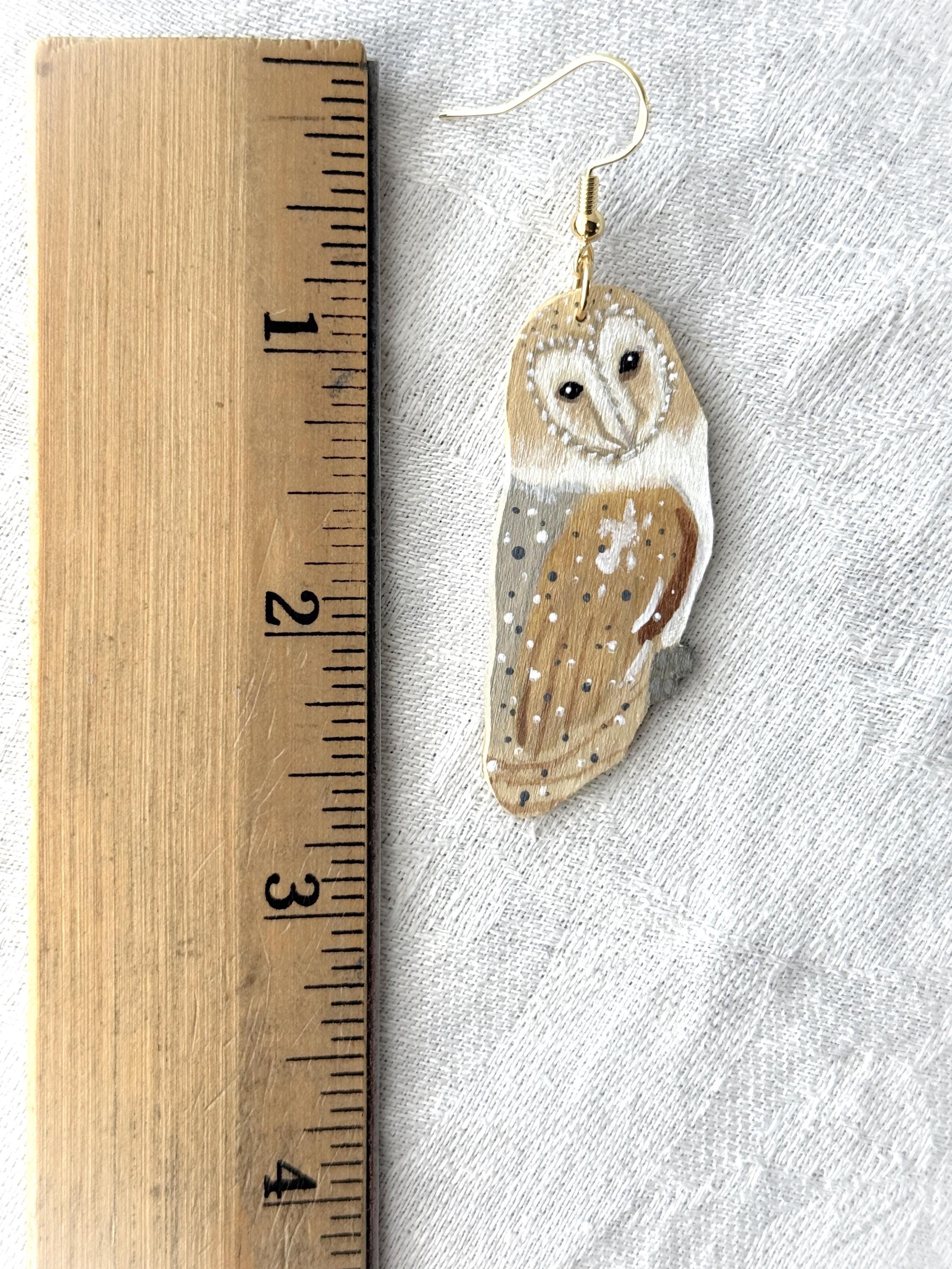 Such a talented artist! These earrings are so pretty, and the owls are so delicately painted. My only critique is that I wish the backs were painted, too. Dangling earrings always shift around, and it irks me when the unfinished side flips front. I would have liked to see the back with a whitewash or the pretty speckled pattern of the owl's wings. But I knew what I was getting, as I wrote the seller and she responded right away. Very pleased with my purchase, and the shipping was prompt and packaging beautifully presented.