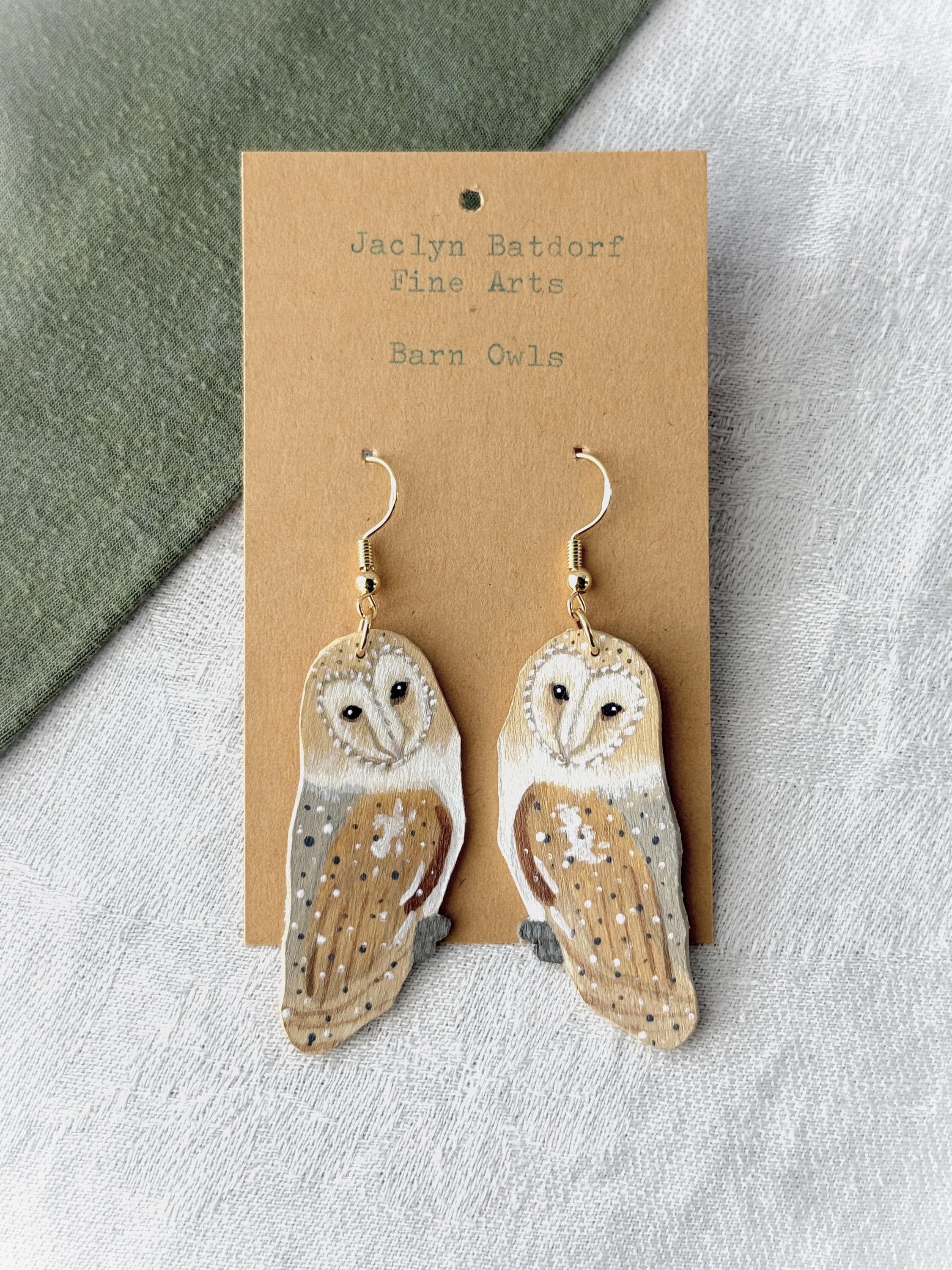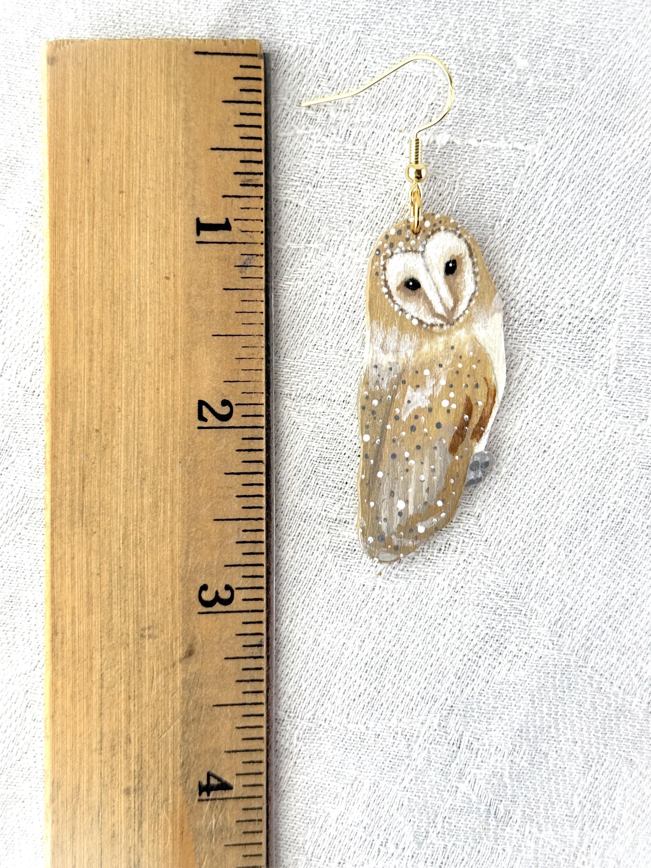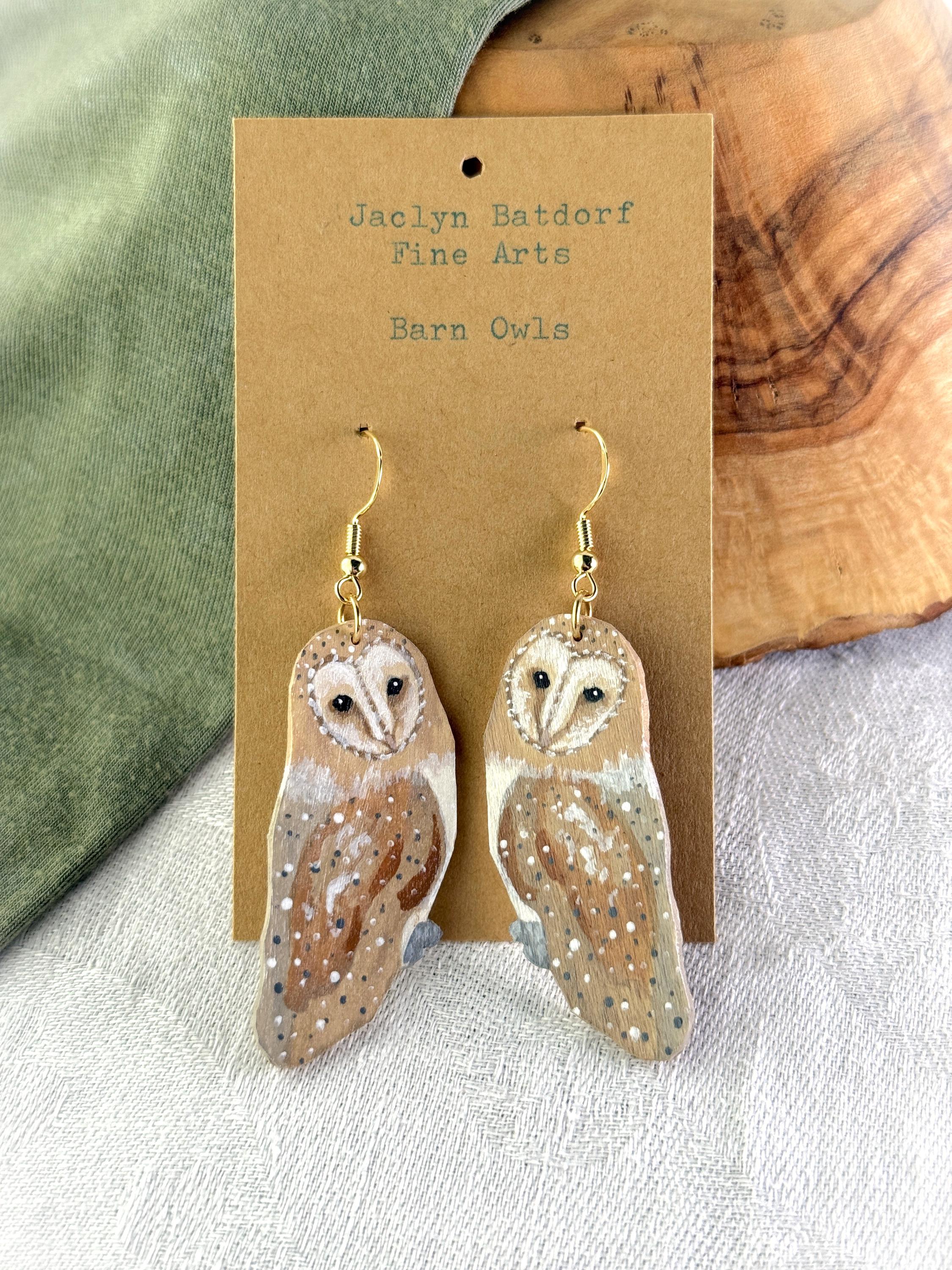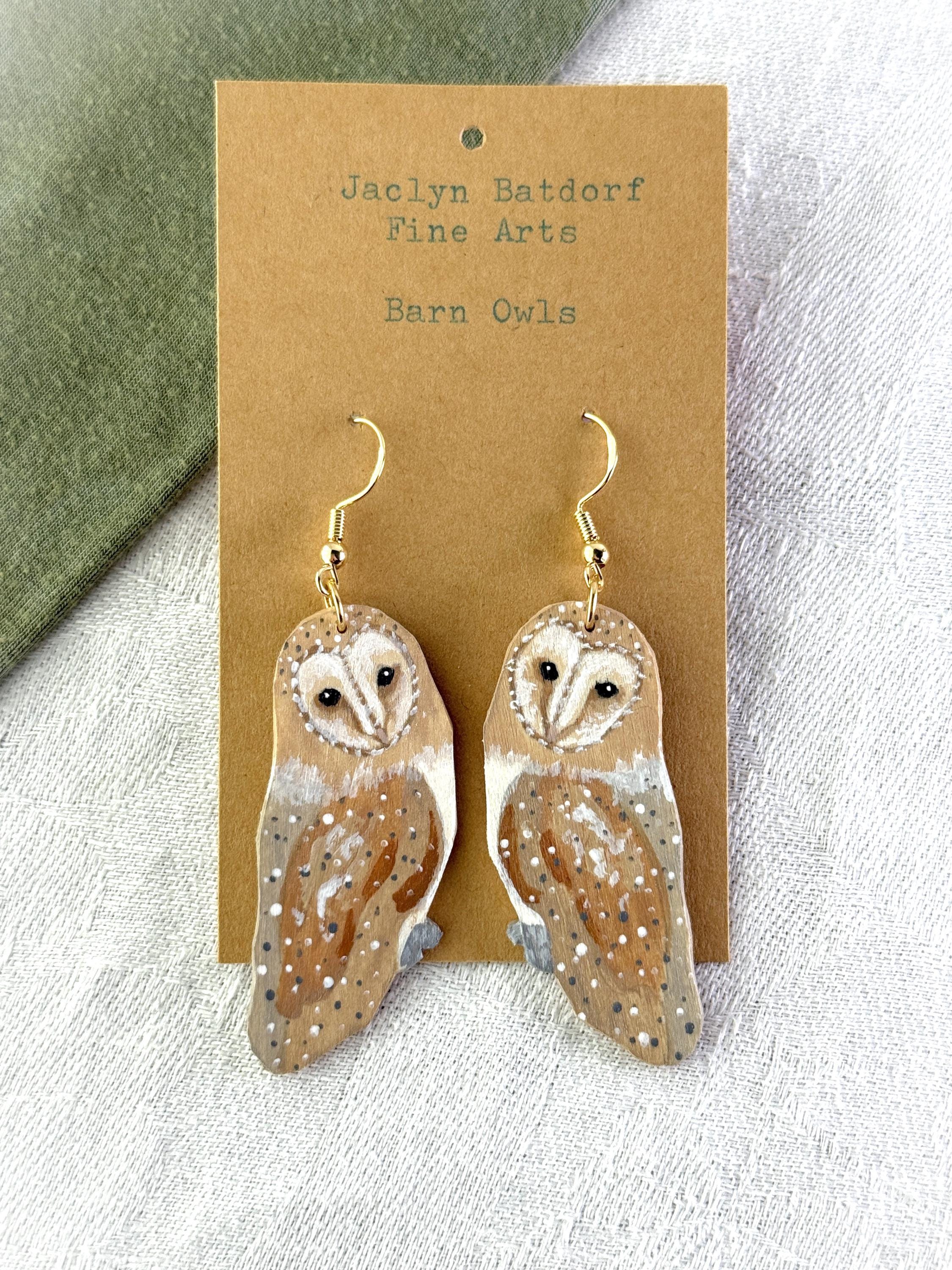 Such a talented artist! These earrings are so pretty, and the owls are so delicately painted. My only critique is that I wish the backs were painted, too. Dangling earrings always shift around, and it irks me when the unfinished side flips front. I would have liked to see the back with a whitewash or the pretty speckled pattern of the owl's wings. But I knew what I was getting, as I wrote the seller and she responded right away. Very pleased with my purchase, and the shipping was prompt and packaging beautifully presented.