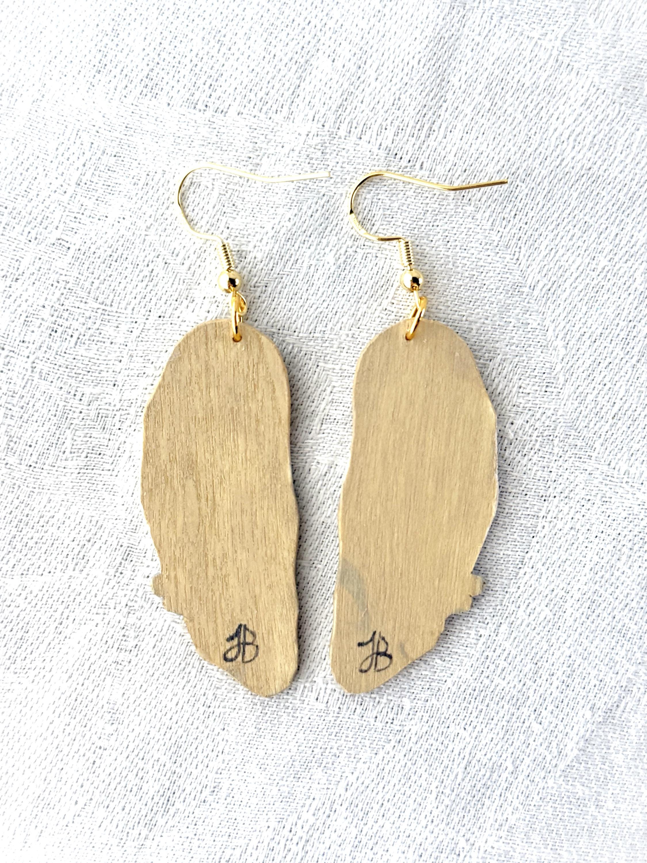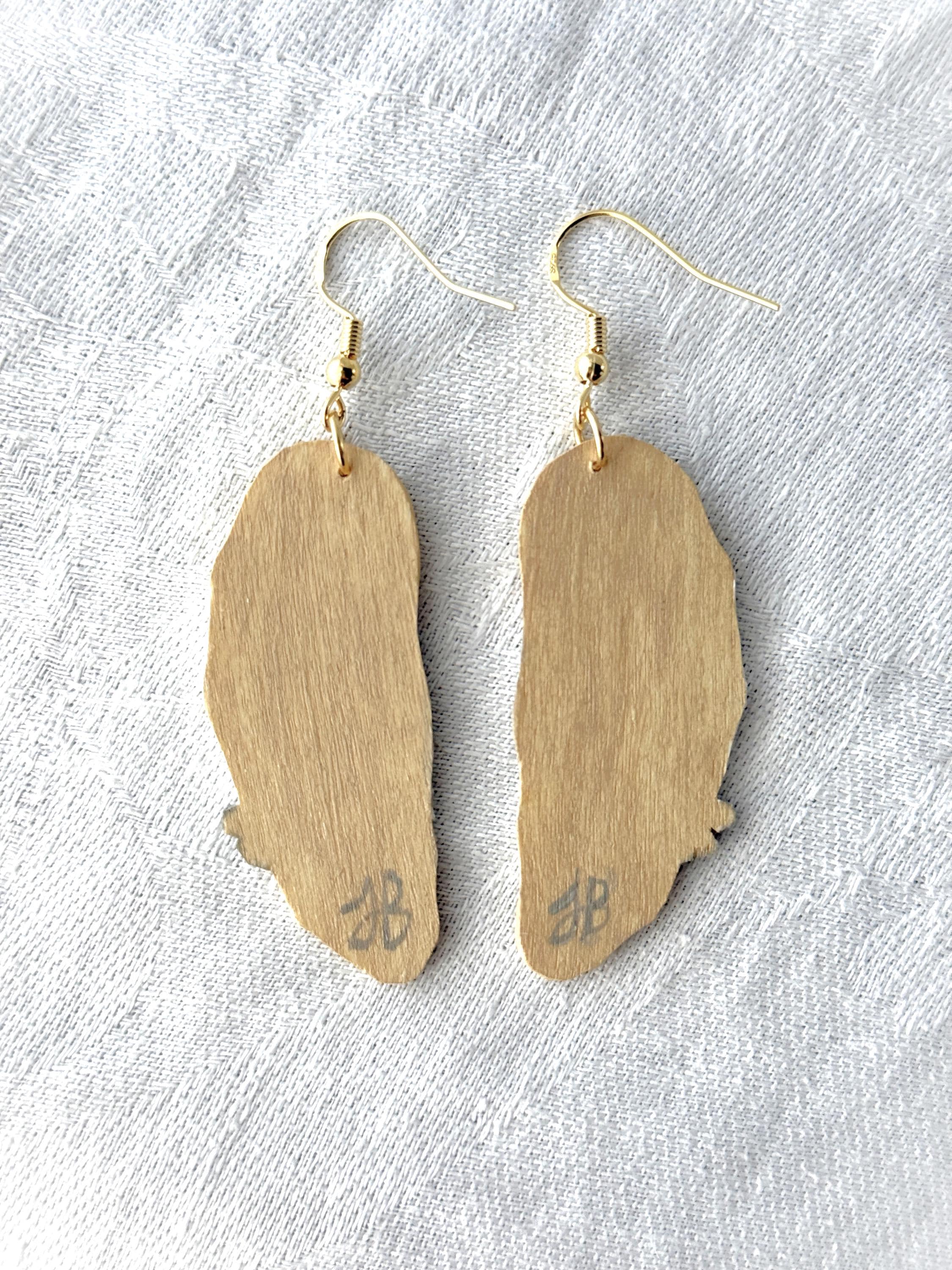 These original handcrafted earrings are carved and painted by hand in my studio and the pair you see in the photos is the exact one you will receive. They are made using acrylic paint on lightweight balsa wood with sterling silver hooks for sensitive ears (the gold hooks are gold plated sterling silver). Orders ship within 1-2 business days with tracking using USPS Ground Advantage Shipping.