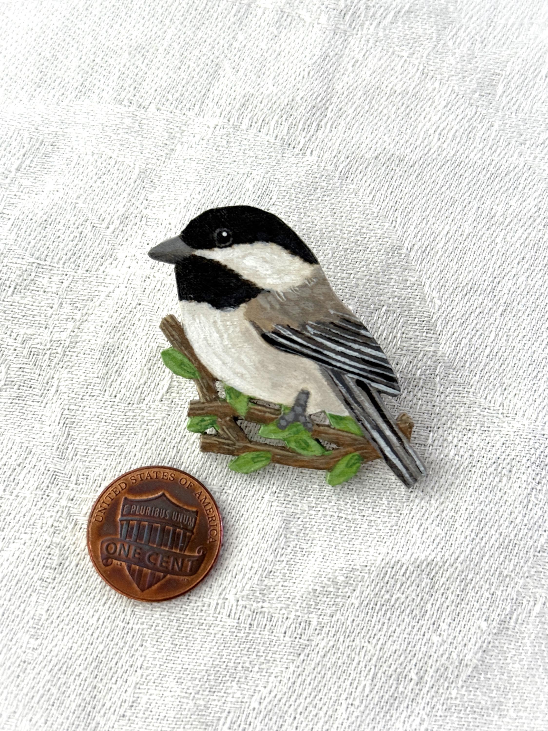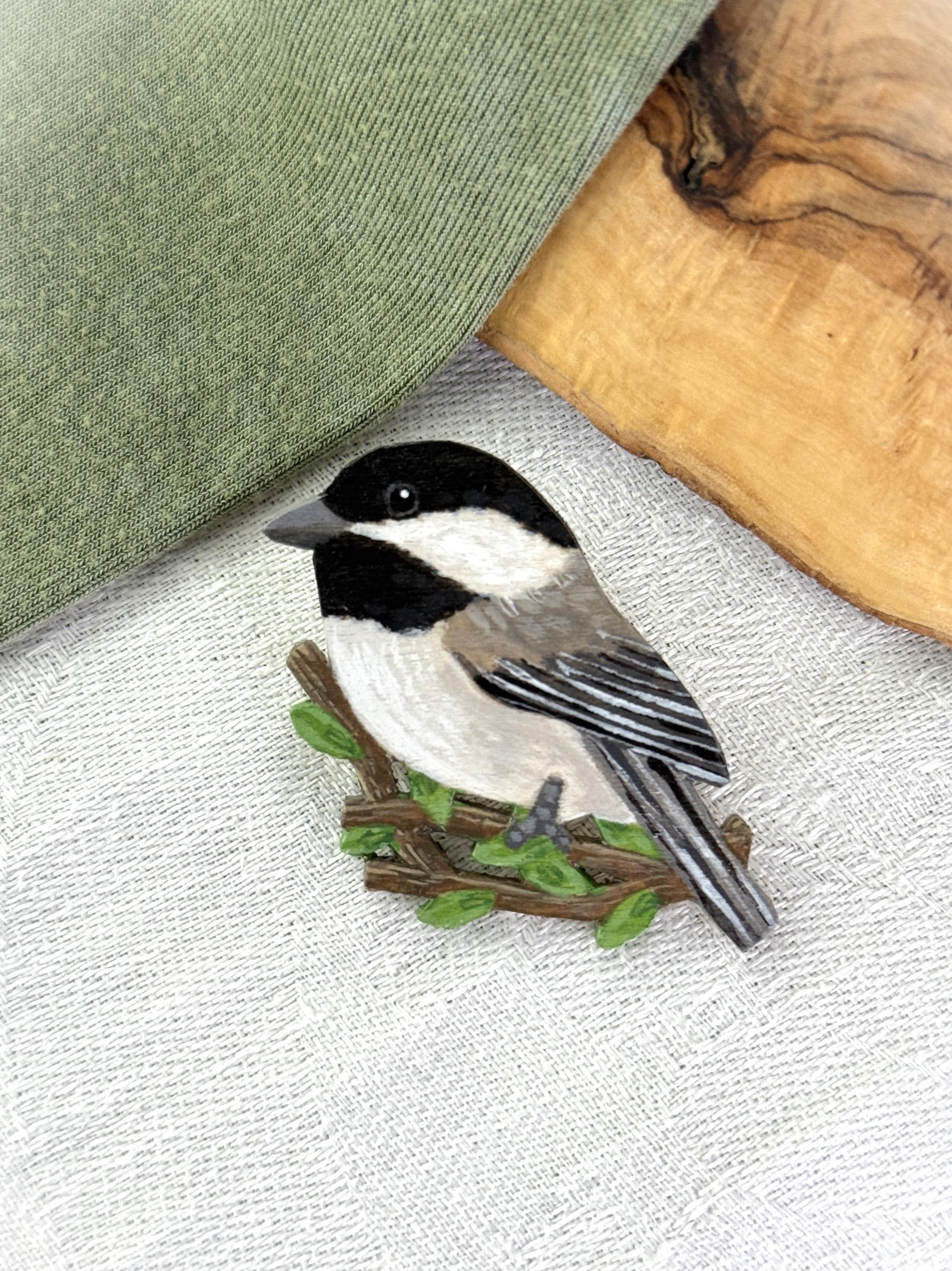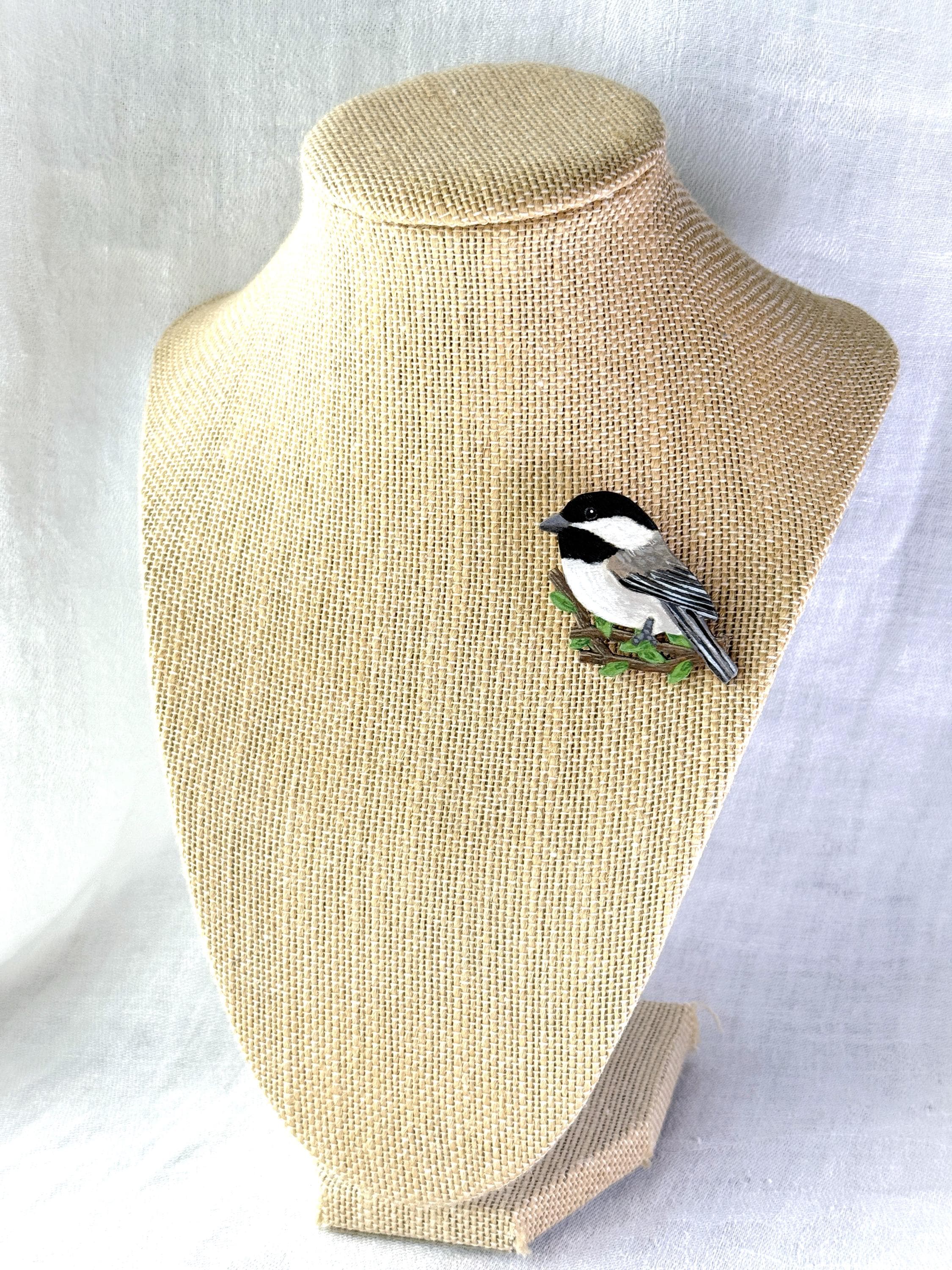 I live in the Rocky Mountains of Colorado. Chickadees are one of the few birds that spend the winter with us. Their cheery song is so sweet to hear on a cold day. This little pin is just beautiful and I will wear it remembering these hearty little creatures.
