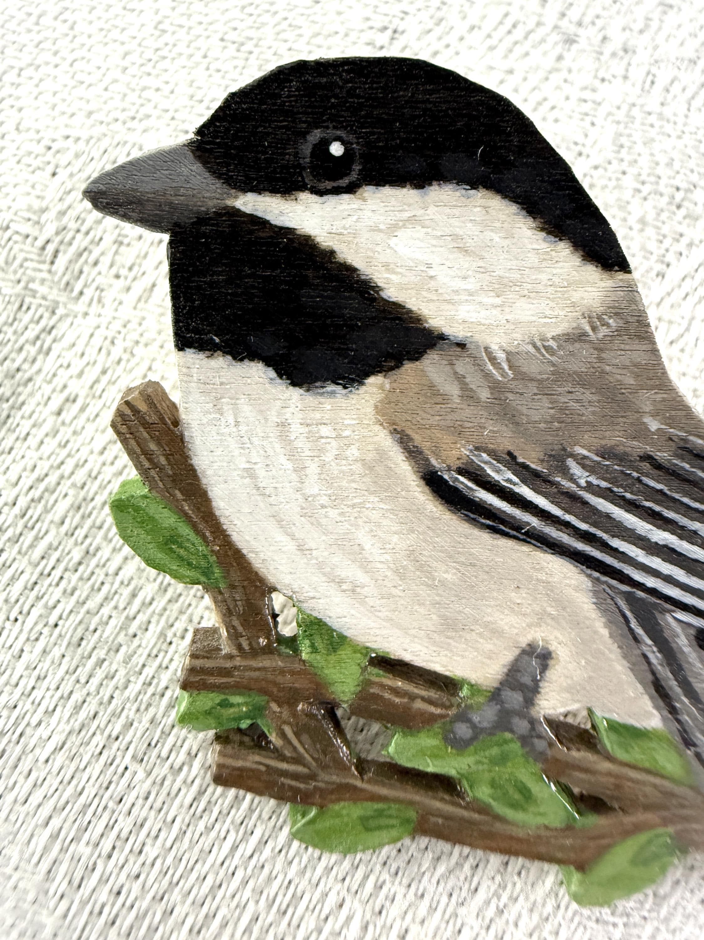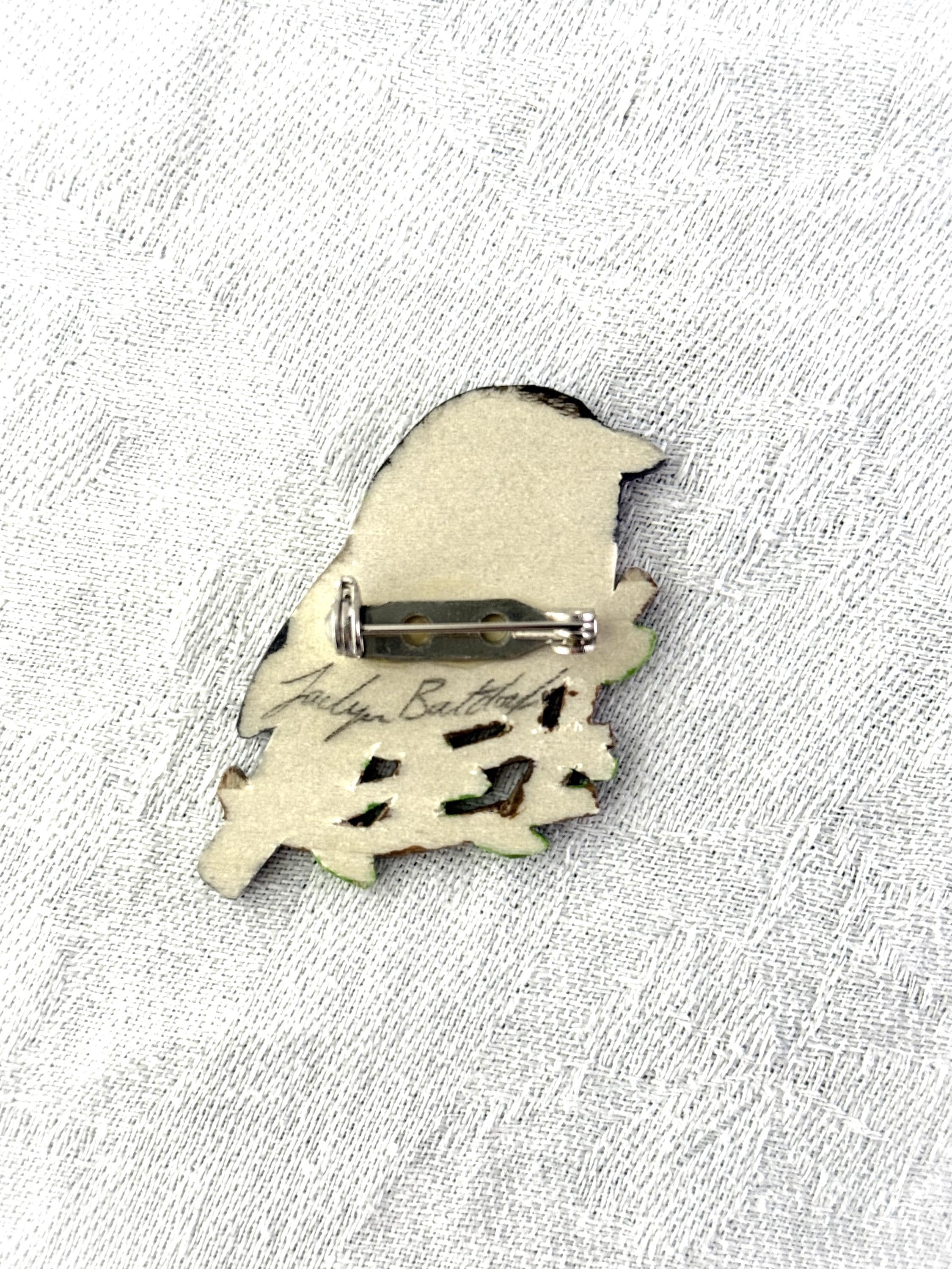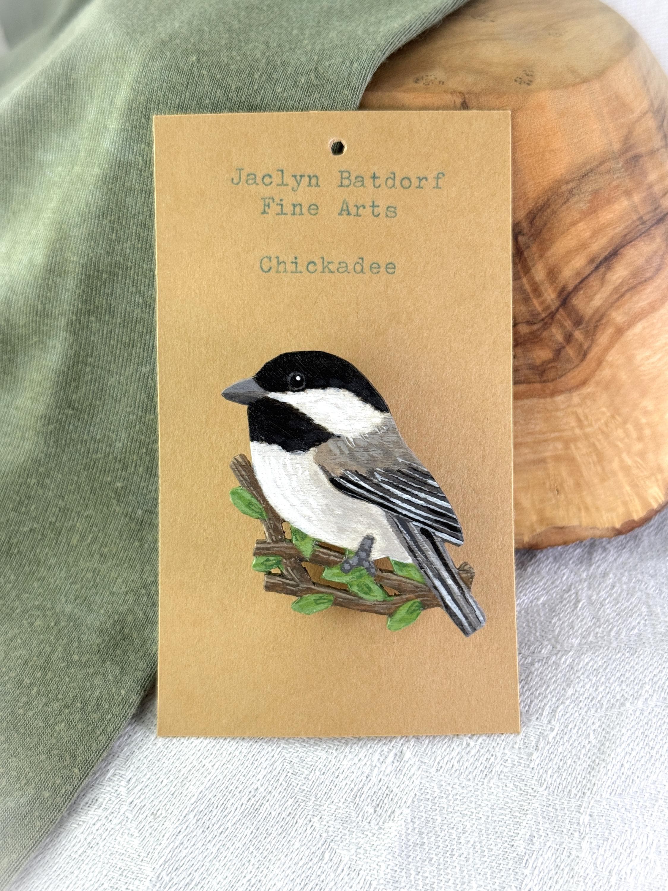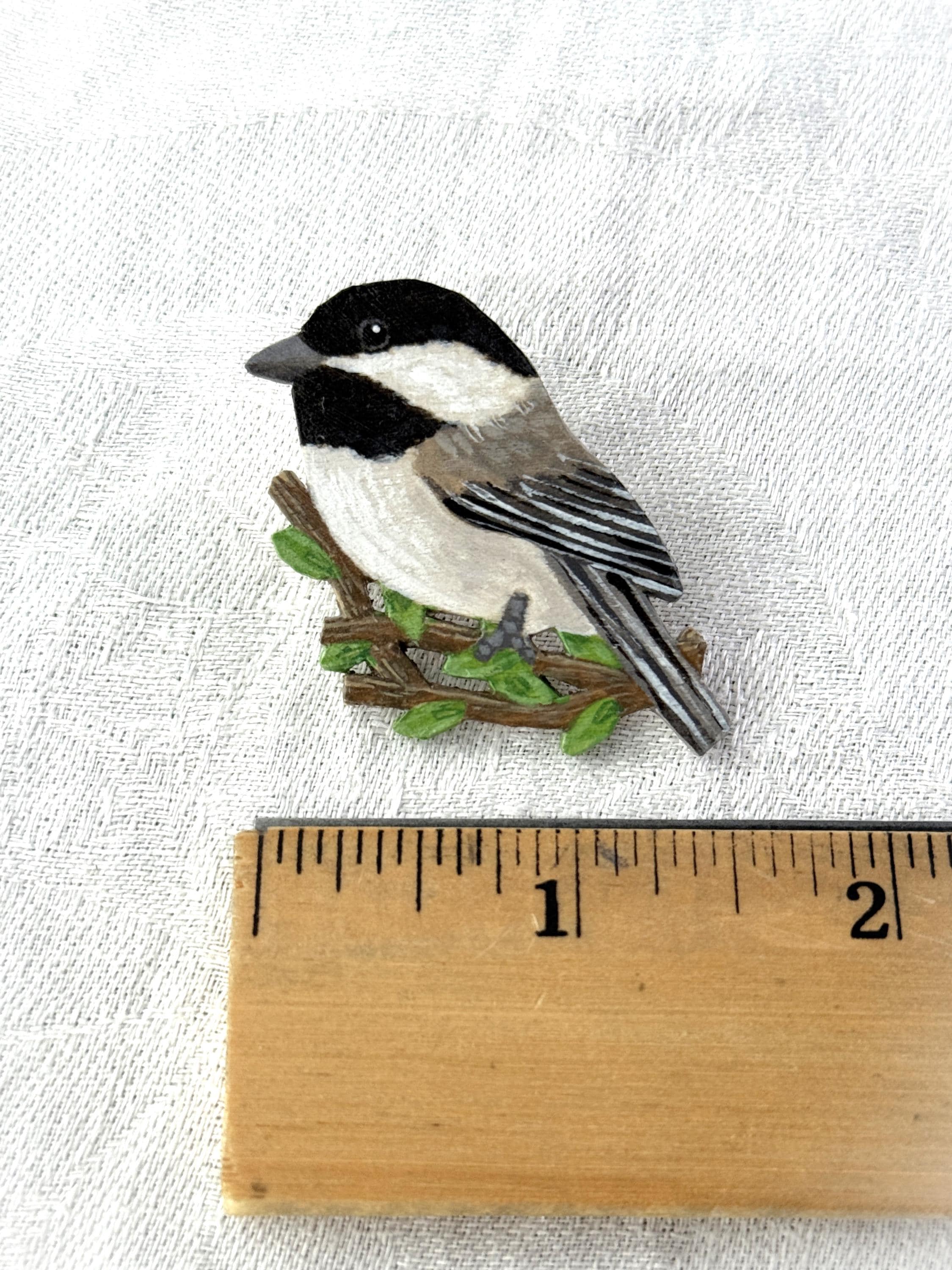 I live in the Rocky Mountains of Colorado. Chickadees are one of the few birds that spend the winter with us. Their cheery song is so sweet to hear on a cold day. This little pin is just beautiful and I will wear it remembering these hearty little creatures.