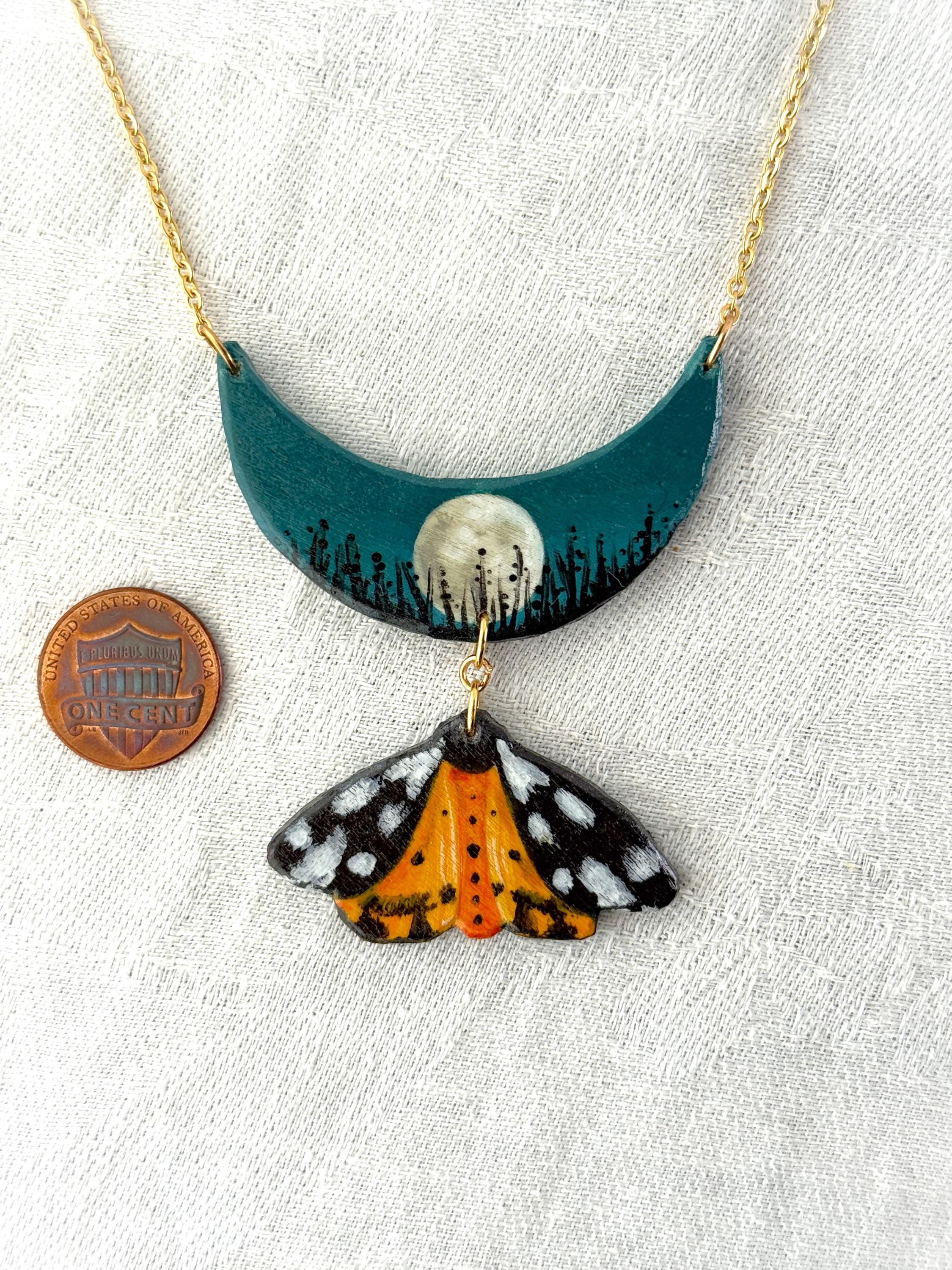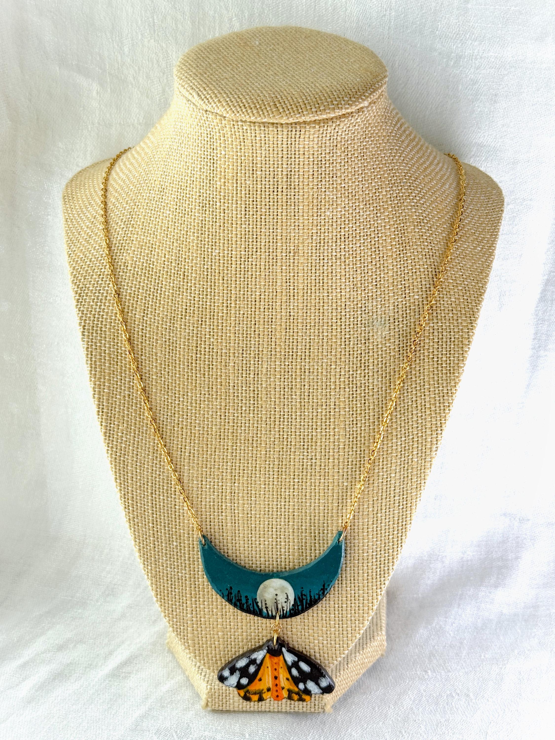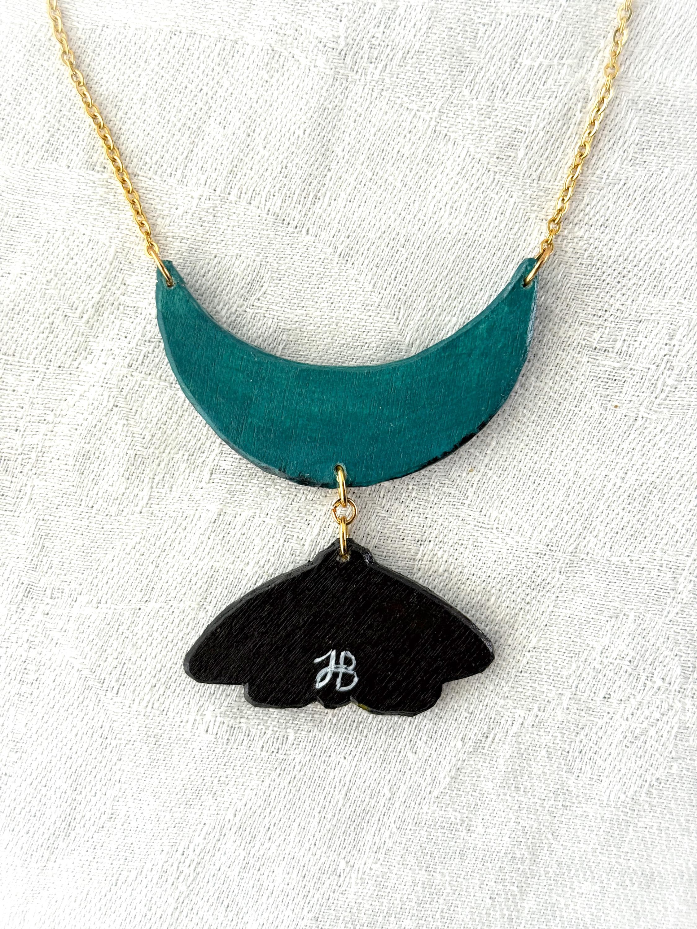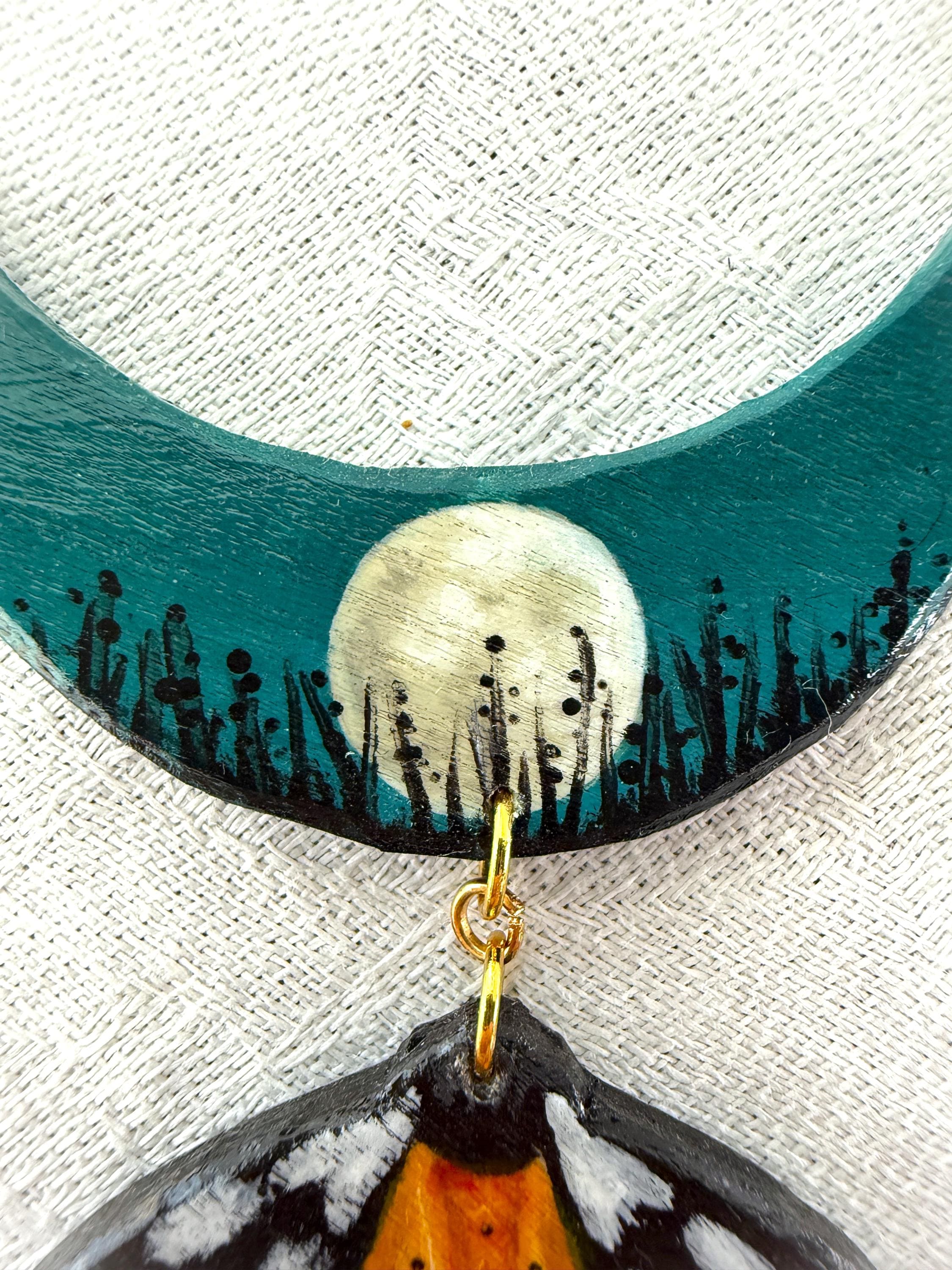 This original handcrafted necklace was carved and painted by hand in my studio and the piece you see in the photos is the exact one you will receive. They are made using acrylic paint on balsa wood with a stainless steel necklace chain for sensitive skin. Orders ship within 1-2 business days with tracking using USPS Ground Advantage Shipping.