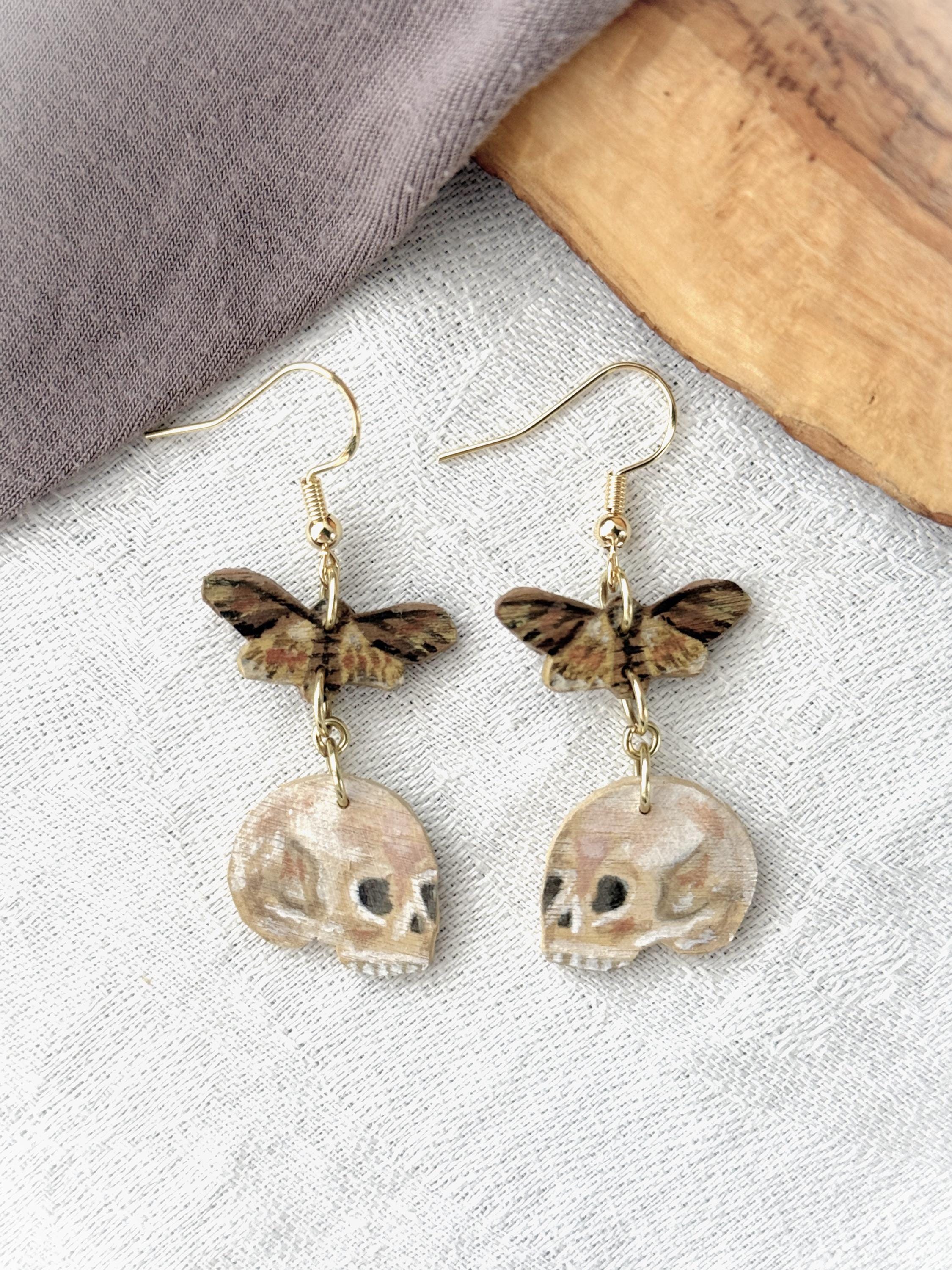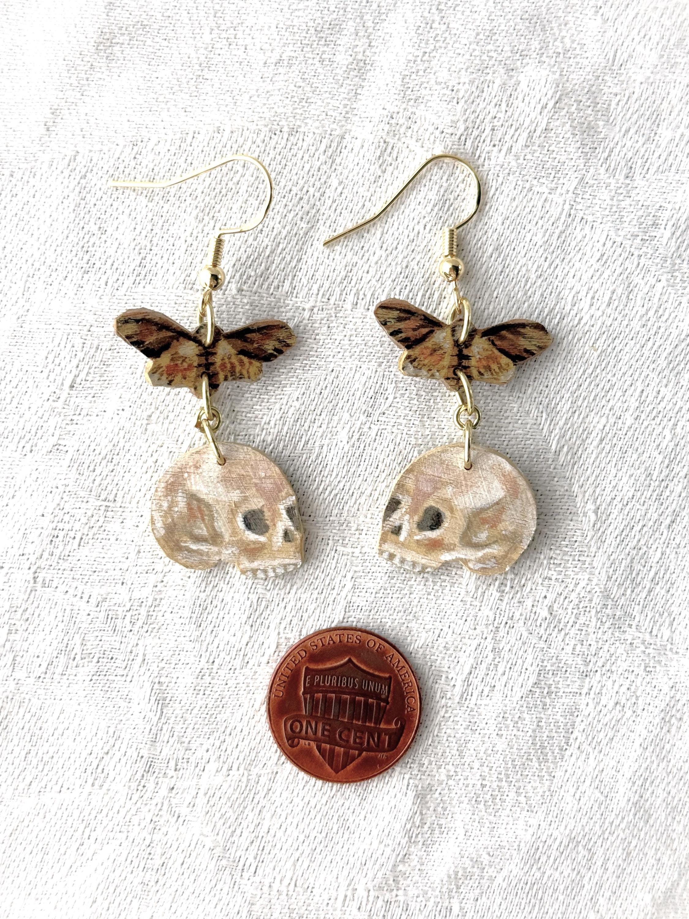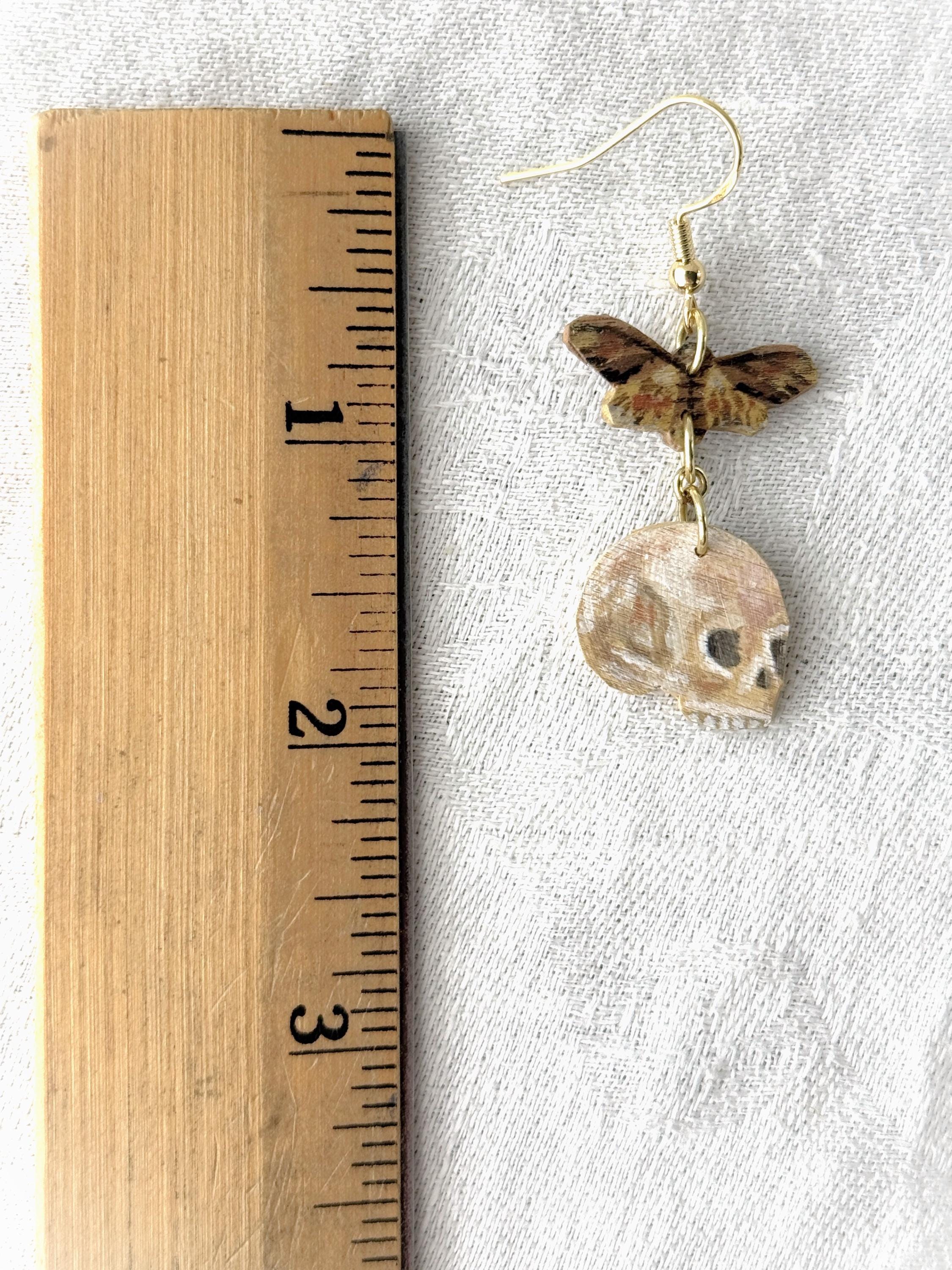 Painted Wooden Moth and Skull Dangle Earrings