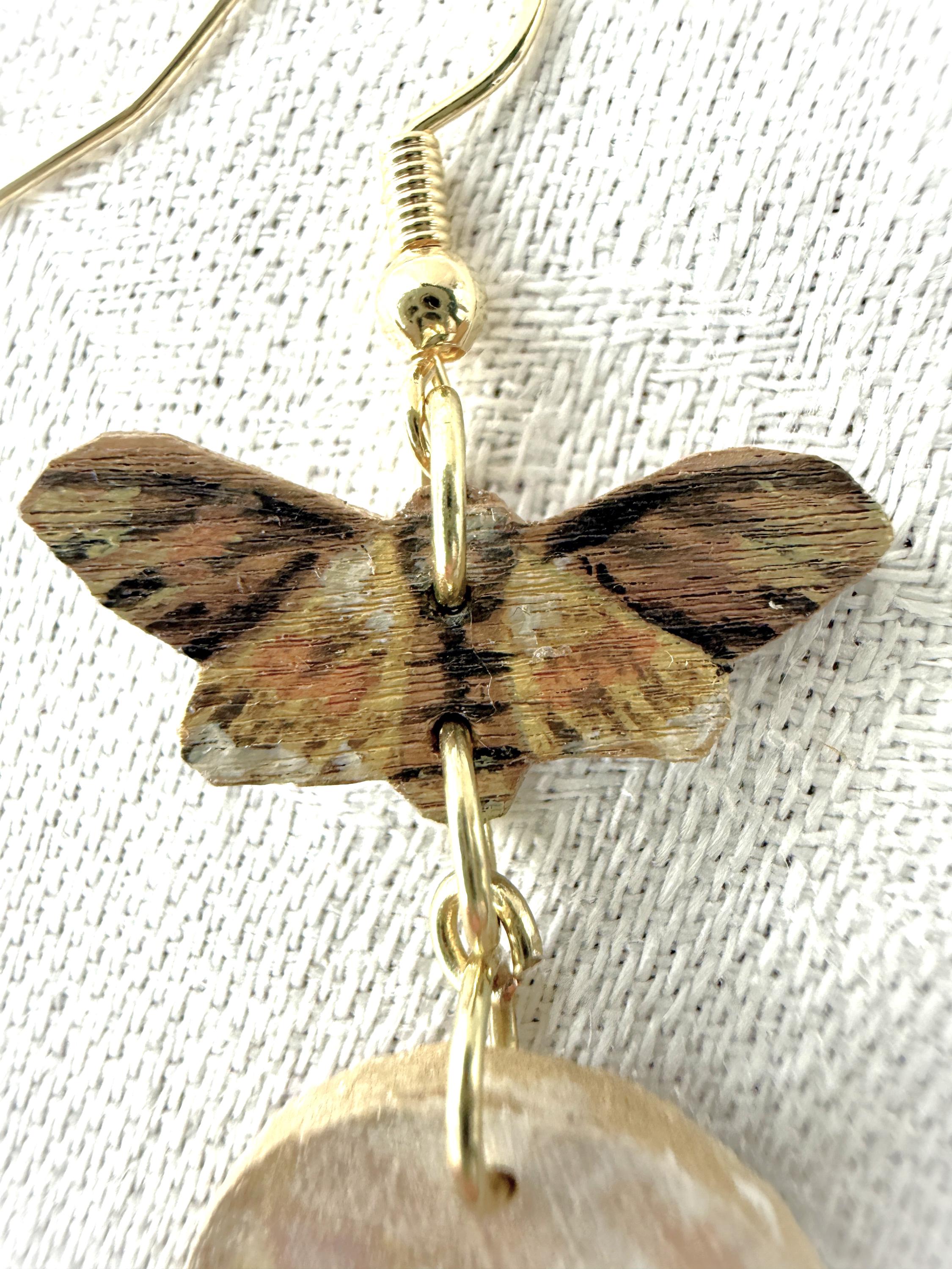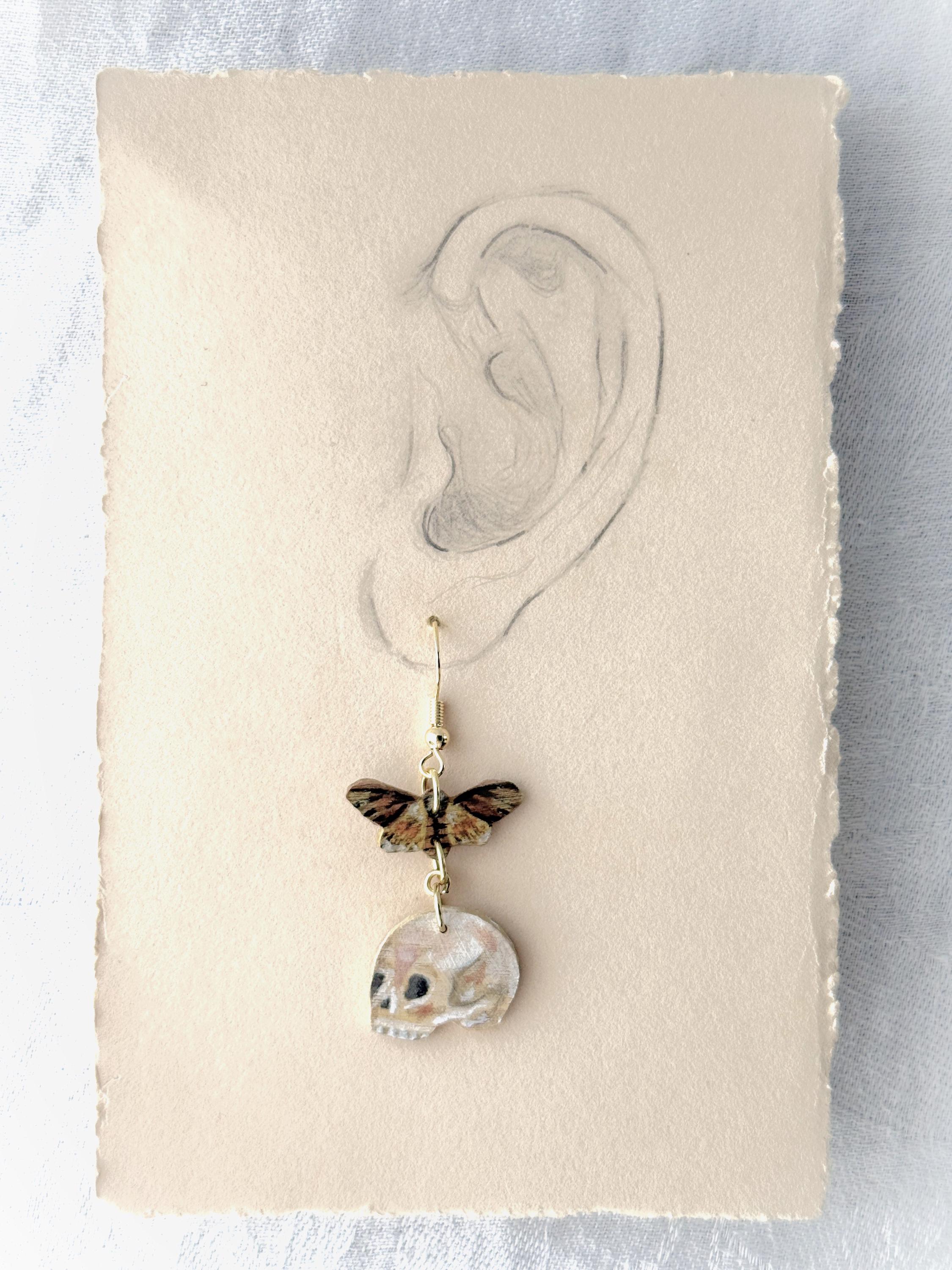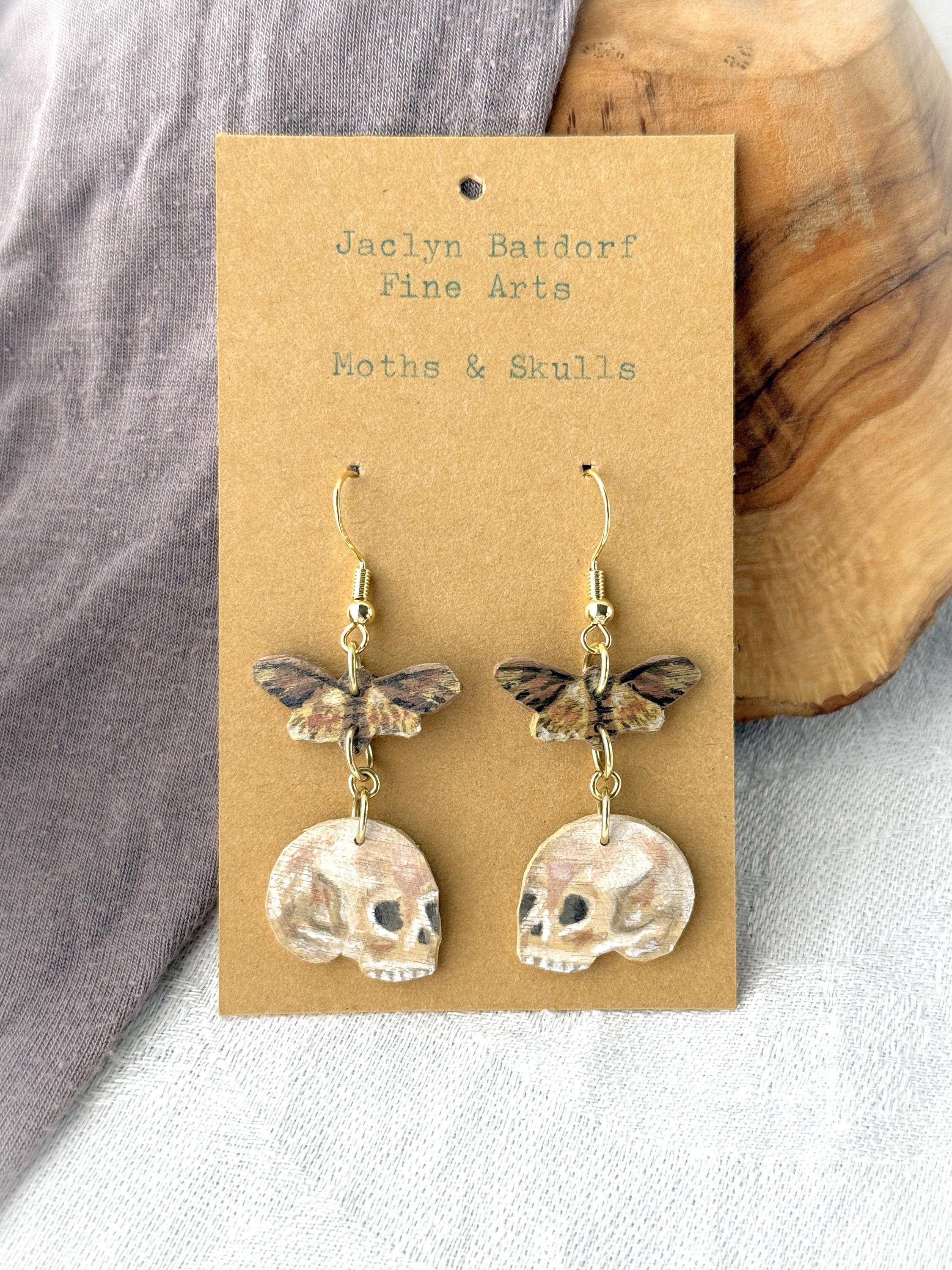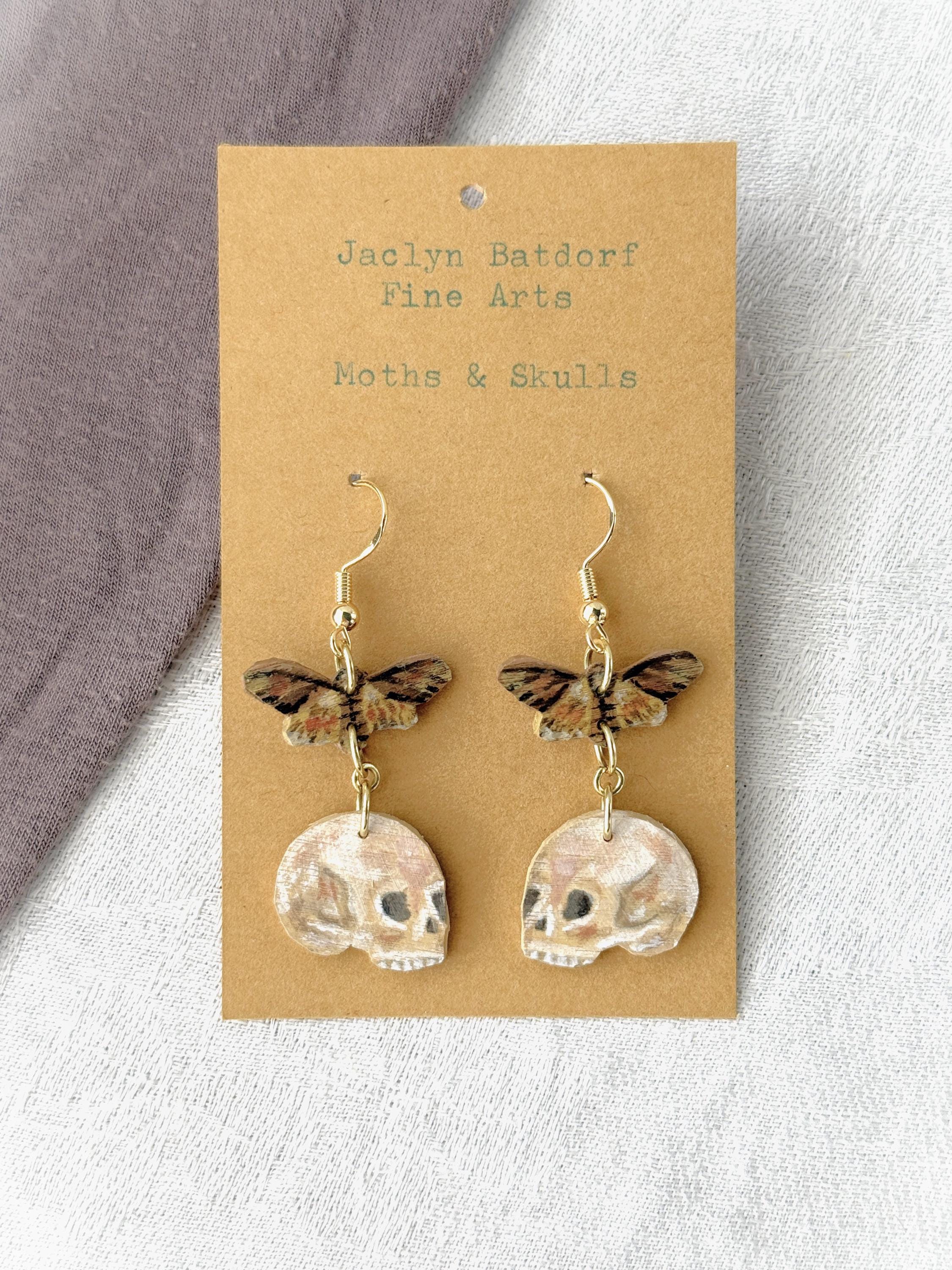 Painted Wooden Moth and Skull Dangle Earrings